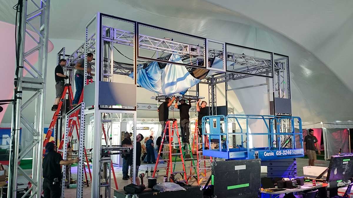 Like many Houston downtown parking lot, the surface is not level. The tent frame and graphics were supported separately to prevent distortion of projected images. The tent was home to Samsung VR Gear headsets paired with Samsung Galaxy S7 mobile devices. Units were set inside the booth’s perimeter, to allow simultaneous VR experiences for as many guests as possible.